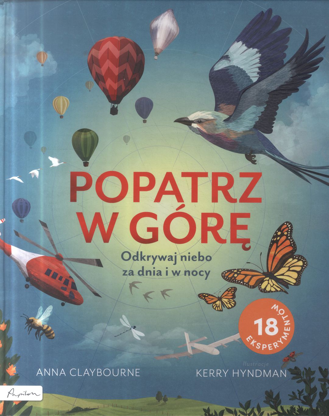 Oto książka z dwustronną okładką: pierwsza część odkrywa przed czytelnikami niebo za dnia; druga skrywa tajemnice nieba nocą. Dzień i noc spotykają się w połowie. Co widać, kiedy patrzymy w niebo? Być może wygląda ono jak bezkresna pusta przestrzeń, ale w rzeczywistości dzieje się na nim znacznie więcej, niż można by przypuszczać. Od chmur poprzez gwiazdy aż po ptaki, samoloty i inne obiekty latające – na niebie jest mnóstwo ekscytujących rzeczy, które aż się proszą, aby przyjrzeć im się z bliska. Z tej książki dzieci dowiedzą się między innymi, dlaczego właściwie niebo jest niebieskie, jak wytropić nocne stworzenia ponad naszymi głowami albo jak starożytni Egipcjanie tłumaczyli sobie zjawisko dnia i nocy. Przekonają się, że… pająki mogą latać! [opis wydawcy].