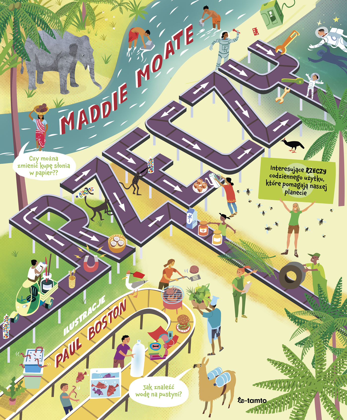 Czy zastanawiałeś się kiedyś, skąd pochodzą twoje rzeczy? Co się z nimi dzieje, gdy przestaną być ci potrzebne? Czy wiesz, że jeśli wyrzucisz stary T-shirt, jego rozkład może zająć 200 lat? Albo że z odchodów słonia można zrobić papier? A plastikowe opakowania z wodorostów? Wyrusz w podróż dookoła świata i poznaj zadziwiające fakty na temat rzeczy codziennego użytku. Od magicznego tuszu po bezmięsne burgery. Ta książka pełna jest przyprawiających o zawrót głowy faktów i niezwykłych opowieści o niewiarygodnych sposobach, jak ludzie na całym świecie i na przestrzeni historii tworzyli, używali i ponownie wykorzystywali otaczające ich rzeczy.