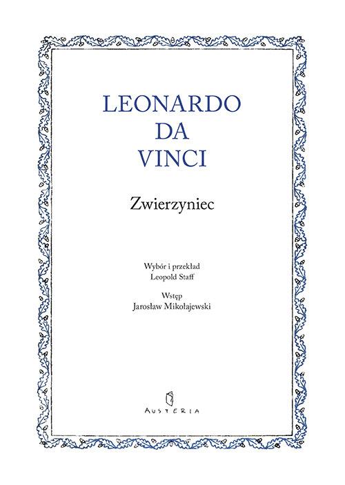 Dla Leonarda świat zwierząt realnych nie jest wyczerpujący. Stwarza, lub odtwarza z bestiariów i legendariów, ze snów i z wyobraźni, istoty nierzeczywiste, jak jednorożec czy bazyliszek, i nie ma w tym nic dziwnego: dla tego artysty, jak dla Dantego Alighieri, fakt, że czegoś lub kogoś nie widział, nie może oznaczać, że ten ktoś albo to coś nie istnieje. Jak czytać "Zwierzyniec" Leonarda? Dowolnie. Tak, jak pozwalają nam go odbierać fantazja, ciekawość, podejście do literatury, od której jedni oczekują zabawy, inni nauki, jeszcze inni wglądu do przepastnej osobowości, a taką przecież osobowością był Leonardo da Vinci. (ze wstępu Jarosława Mikołajewskiego)